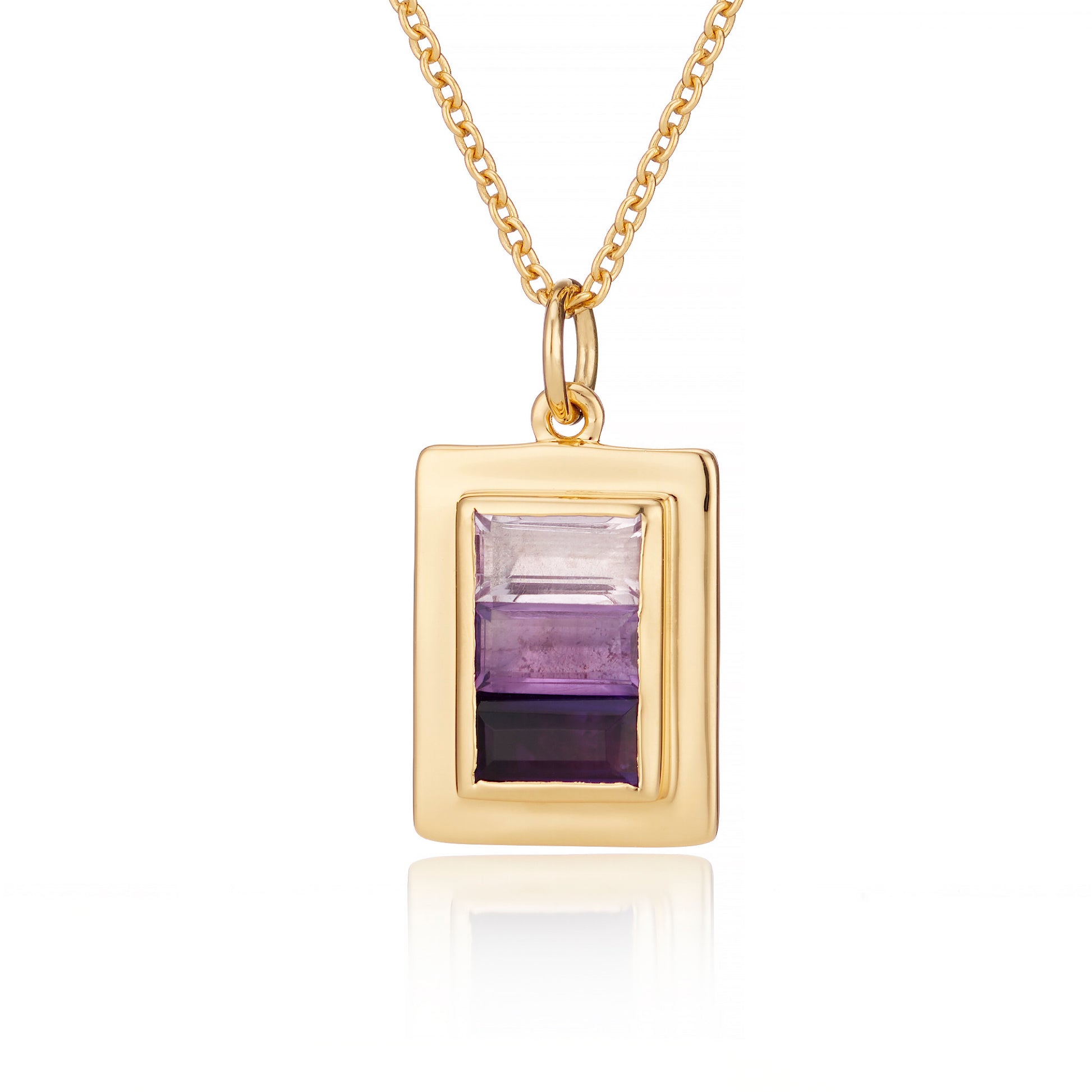 This unique pendant features baguette cut amethysts in gorgeous shades of purple creating an ombre effect.